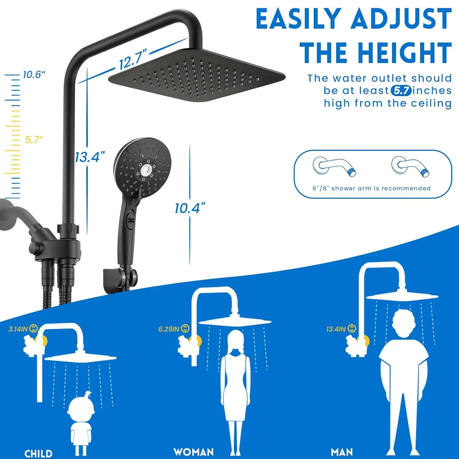 Dual Shower Head Combo Rain Shower with Handheld Spray 6 Settings Adjustable Slide Bar